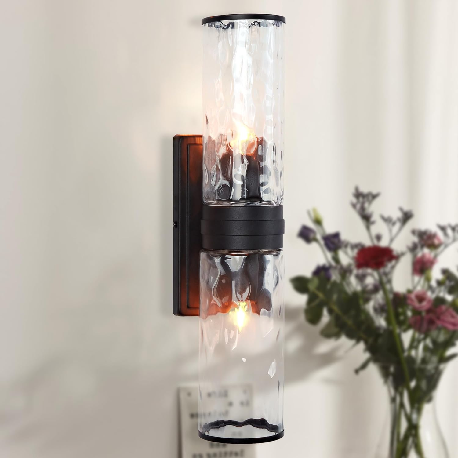 This a versatile sconce fixture perfect for adding elegance to any space. Whether you're looking for a bathroom sconce, bath sconces, wall lights for the bedroom, or wall lamps for the bedroom, this piece has you covered. Made in China with attention to detail.The combination of hammered glass and candelabra bulbs creates a calming and modern illumination for your bath.Available in a range of rich finishes to complement your decor.Crafted from high-quality materials including aluminum, brass, mild steel, stainless steel, and glass.Choose from Chrome, Brass, Matte Black finishes to match your style.Clear glass shades with a hammered effect add a touch of sophistication.Can be mounted vertically or horizontally to suit your space.Light Bulb(s) not included; accommodates two 40W Type B Candelabra Bulb(s) or LED equivalent.đ·CARE:To protect the finish, avoid using abrasives or household cleaners; dust with a soft dry cloth.Do not exceed the specified wattage.Outdoor damp rated fixtures should only be used in covered, fully protected locations.đ·ASSEMBLY:Hardwired; professional installation recommended for safety.đ·DIMENSIONS:OVERALL: 4.5" w x 5" d x 15.5" hSHADE: 3.5" dia x 7.5" hBACKPLATE: 4.5" w x 7.5" h x 0.5" tWEIGHT: 5.5 lbsElevate your space with this exquisite Sconce, a versatile and stylish lighting solution for any room in your home.Our lighting fixtures contain delicate and fragile components, such as glass globes, glass panels, crystal, alabaster, shell, and ceramic. If any parts are damaged during shipping, please contact us through Amazon's message, and we will be dedicated to providing you with the best service within 24 hours.