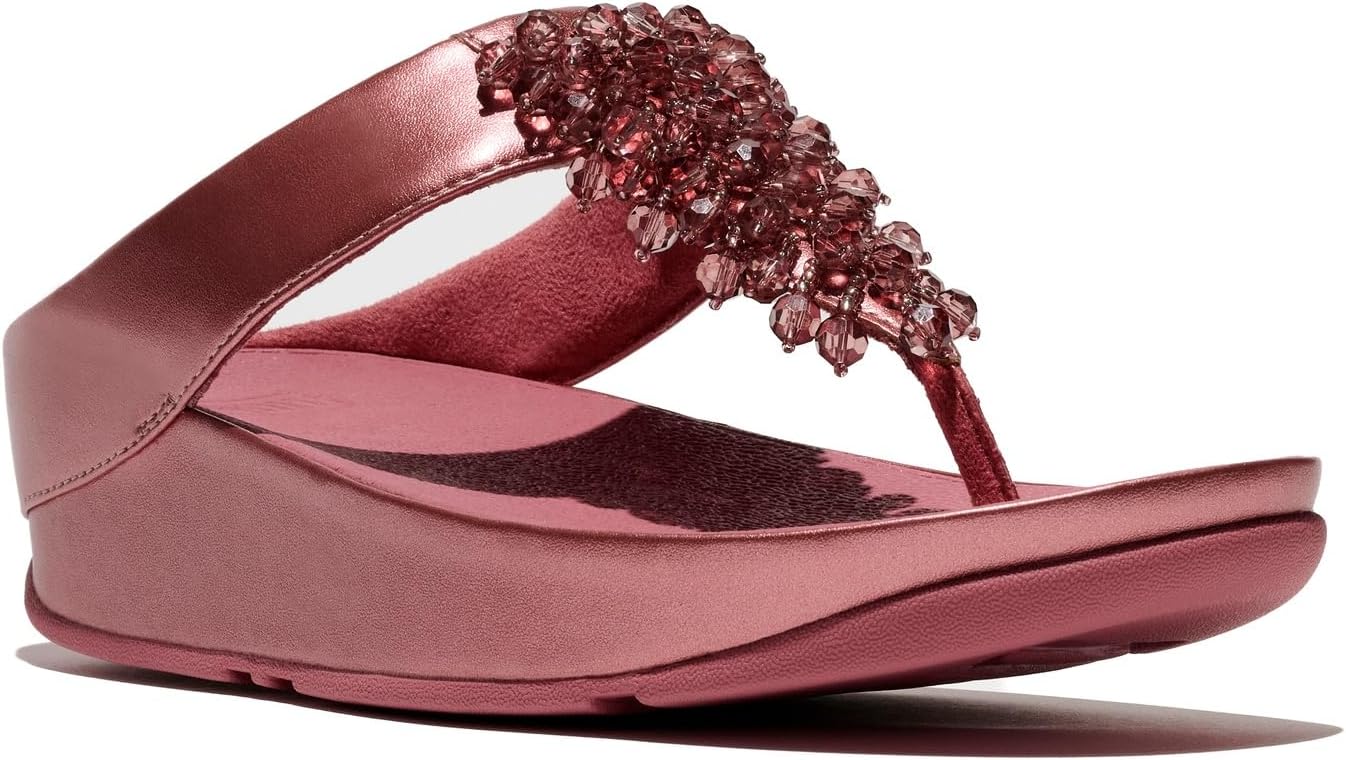 Do the Rumba in these glittering, graceful sandals. Swathed in a swishy, shimmying, new-design fringe – sparkling round faceted beads on strings of shiny micro-beads. Slim uppers are crafted in shimmering metallic faux-leather (including the sole 'wrap'). Flattering on your feet. With a soft microfiber toe post. On FitFlop's Microwobbleboard™ midsoles for unbeatable comfort and cushion – whether you're walking around during the day or dancing through the night. Slip them on and find a party! Ergonomically engineered to help optimize your body's alignment, natural movement & energyLight pressure-diffusing Microwobbleboard midsole – triple-density cushioning follows 3 footstep stages (firm heel/soft middle/medium at toes)Natural arch supportGrip suited to everyday use/road tread These shoes have been granted the APMA* Seal of Acceptance, for footwear found to promote good foot health *American Podiatric Medical Association