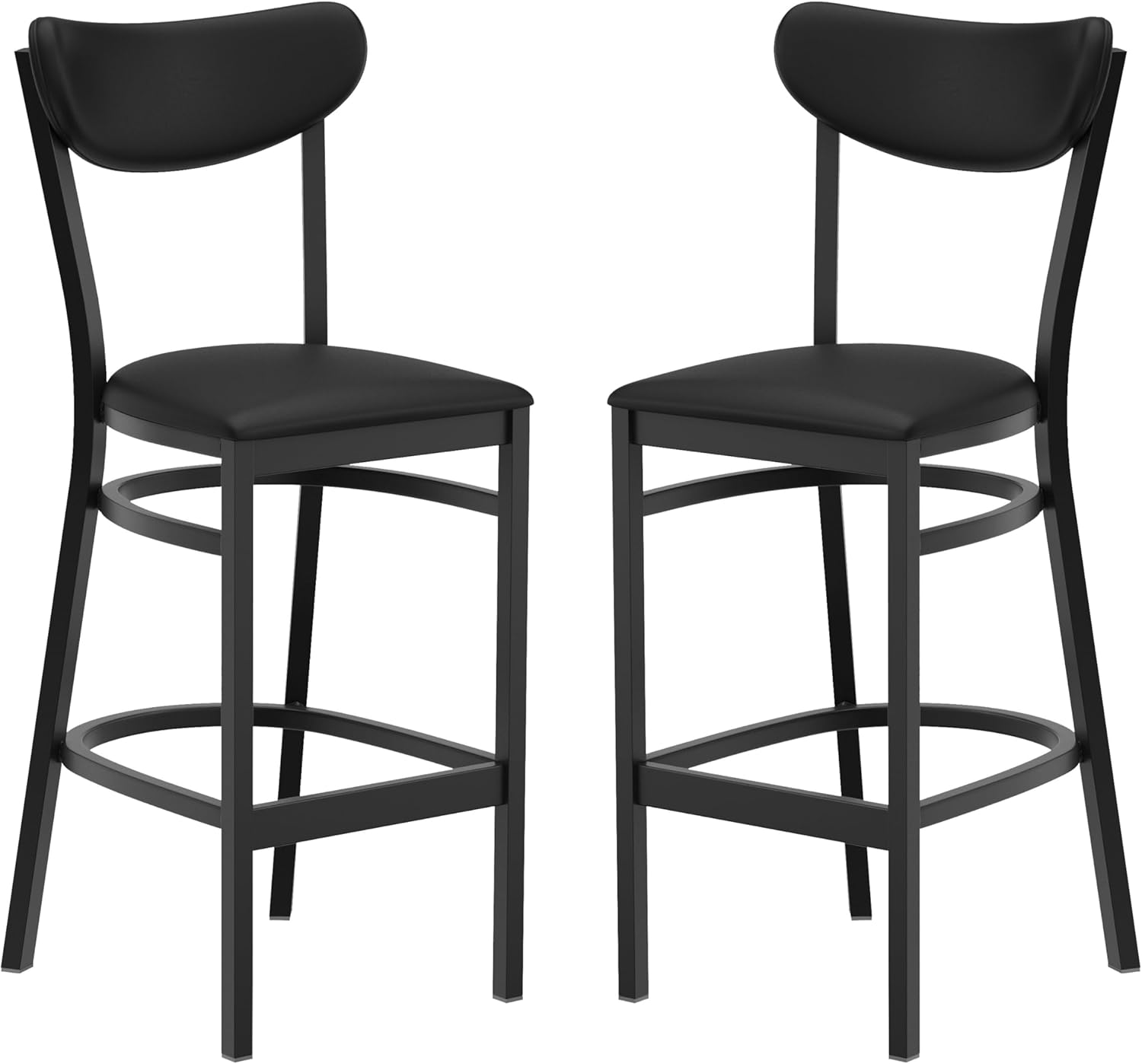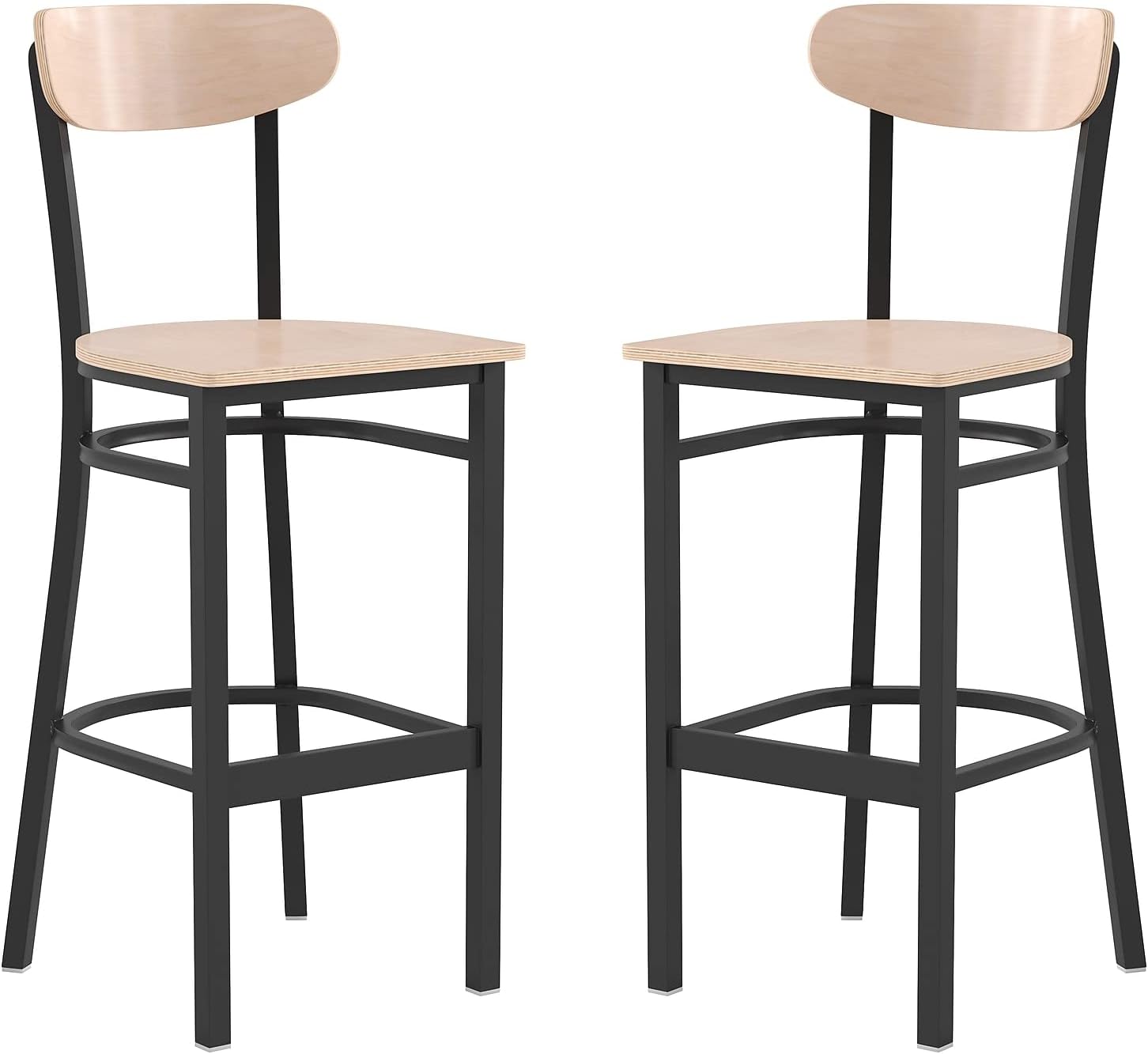 Welcome guests time after time with a new era of long-lasting but beautiful commercial seating. Designed for use in the hospitality industry, as well as your busy household, these barstools offer solid wood seats and boomerang backrests atop ultra-strong, powder coated steel frames that hold up to 500 lbs. static weight. The lower bracing serves double duty as a footrest to relieve pressure from the legs for a comfortable seating experience. Assembly takes less than 10 minutes and a damp cloth is all that is required for easy cleanup. Available in dining height, in 2 finishes, and in sets of 2, this sleek modern stool is ideal for restaurants, pubs, cafe, or your kitchen counter or basement bar.