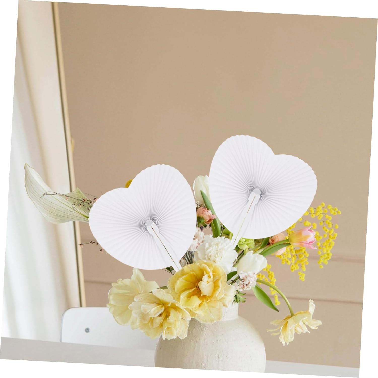 Package List 48 x paper fan Features - Color: White wedding favors hand folding fans. - Mtaerial: Paper and plastic paper fans for wedding. - Size: 25.00X22.50X1.20cm;/9.82X8.84X0.47in; fans handheld foldable - With small size and folding design, it is easy to carry wedding favors. - Pure white color allow you to DIY or paint wedding party favors. - It is necessary little goods for fan paper. - Perfect handcrafts for your families and friends wedding. - The folding paper fans can be used as wedding favours to help keep your guests cool during the day or use in the photos to make interesting and unique memories fans handheld folded.Goods Informationfans handheld foldable This product is a folding hand paper fan manufactured with special heart shape design and pure white color.wedding fans It can be a decoration for party or wedding and add romantic atmosphere for you.blank paper fans The paper fan symbolizes friendship, respect and good wishes, hence their increasing popularity at weddings and birthday celebrations
