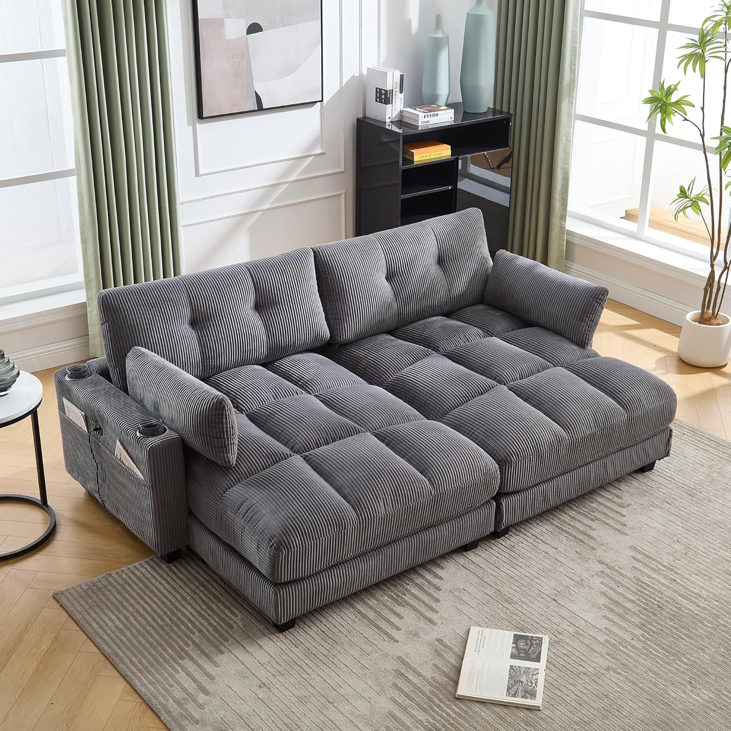 Oversized Lounge Chaise Convertible Sleeper Sofabed, Corduroy Sleeper Daybed Indoor Recliner Chair Sofa Bed with Cupholders and Adjustable Headrests for Living Room Bedroom Reading Home Apartment