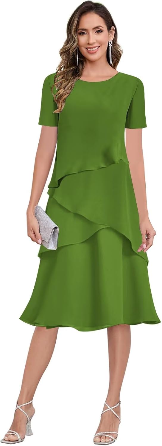 Product Features Fabric: Chiffon Design: A Line, Asymmetrical, Ruffle, Build in Bra, Fully Lined, Short Sleeve, Zipper Back Occasion: Mother of The Bride/Groom/Grandmother, bridesmaid dresses, prom dresses, formal dresses, evening dresses for women, wedding dress for mother of the bride, formal evening party, wedding guest dresses, formal party, holiday cocktail dance, anniversary engagement, rehearsal dinners, red carpet, outdoor, club, dating, and any other formal affair. Neckline: Scoop Neck Hemline:Tea Length How to choose size?If you want to make the dress fit better,please refer to these measurements as below.1.Bust _____ inch 2.Waist _____ inch 3.Hips _____ inch 4.Hollow to floor(Shoulder to Feet without heels on) ___ inch 5.Height: _____inch 6.The height of your high heel shoes: _____inch NOTES: Due to display, lighting, environment, different batches of fabrics and other reasons, there may be a slight color difference phenomenon. Hope to get your understanding!