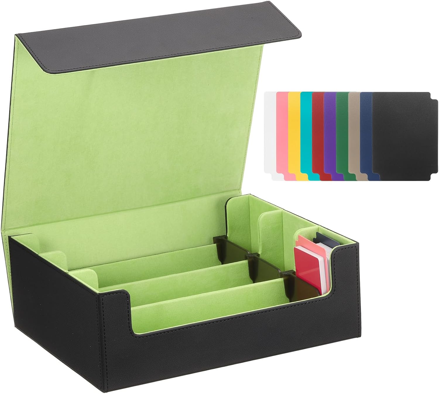Description:Durable Material: This card storage box is made of PU leather, which is sturdy, waterproof, anti-scratch, and wear-resistant. It provides solid shock protection, and the soft polyester lining protects your cards from scratches and other damage.Magnetic Closure: The box features a secure magnetic flip to prevent accidental opening and ensure enhanced protection. The reliable magnetic mechanism keeps your cards safe and intact even during travel or storage.Great Organization: The card deck case comes with 10 pcs of colorful card divider tabs that can help you separate different types of game cards, making it easy to organize and categorize cards and accessories.Wide Application: This trading card storage box can hold up to 1800 cards, perfect for people who like to collect cards or play games. It is also a practical gift for family or friends with a card-collecting hobby on birthdays, Christmas, Valentine's Day, and anniversaries.Specification:Package Includes: 1 x Trading Card Storage Box with 10 Pcs Card Dividers + 3 Pcs Card HoldersColor: Blue/GreyMaterial: PU Leather + PolyesterTotal Size: 29 x 24.5 x 10.5 cm/11.4 x 9.6 x 4 inch (L*W*H)Card Holder Size: 7.2 x 5 cm/2.8 x 2 inch (L*W)